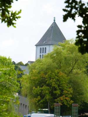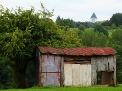 Vom Startpunkt der Wanderung erblickt man bereits in naher Ferne den Kirchturm der wohlgemerkt neuen Abtei Kornelimünsters. Es war ein kleiner Franzose mit Hut namens Napoleon, der einst den Mönchen in Kornelimünster das Bleiben verbot und den dortigen Reichsabt seiner Macht beraubte. Erst zu Beginn des 20. Jahrhunderts kehrten die Benediktiner in den Ort zurück und zogen alsbald in neue Klostergebäude inklusive Gotteshaus ein, dessen Kirchenturm wir hier in der Ferne sehen. (Es handelt sich um den weissen Kirchturm im Hintergrund und nicht um den Schuppen da vorne.)