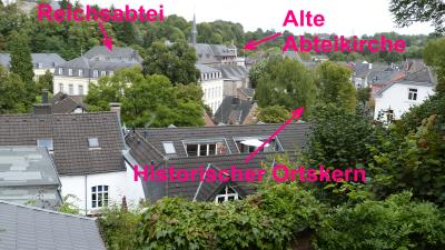 Man sieht im Tal liegen den alten Ortskern mit Abteikirche und Abteigebäuden.